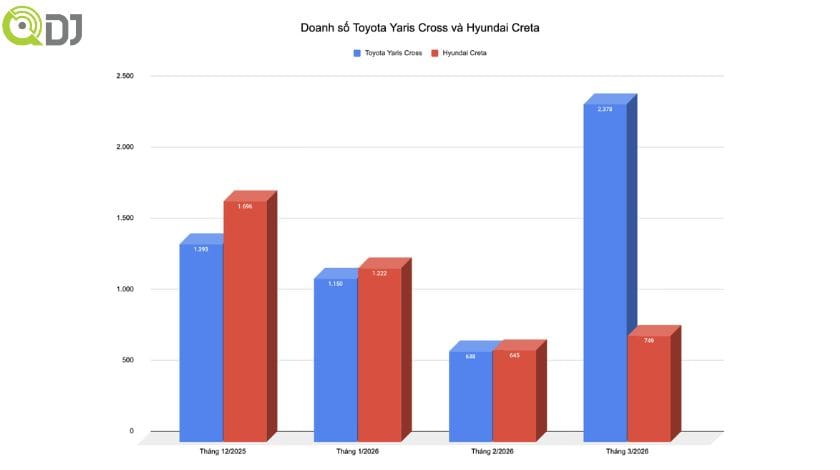 Sau giai đoạn đầu năm đầy thách thức, Toyota Yaris Cross đã tạo nên một cú hích lớn trong tháng 3/2026. Cụ thể, doanh số của mẫu xe này đạt 2.378 xe, tăng trưởng gấp gần 4 lần so với con số 638 xe của tháng 2.