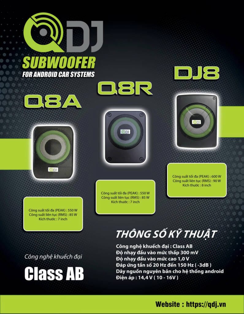 QDJ mang đến nhiều mẫu subwoofer thiết kế gọn gàng, dễ lắp đặt dưới gầm ghế hoặc khoang xe. Không chiếm diện tích nhưng mang lại hiệu quả rõ rệt, phù hợp cho cả những khách hàng mới làm quen với việc “độ” âm thanh.